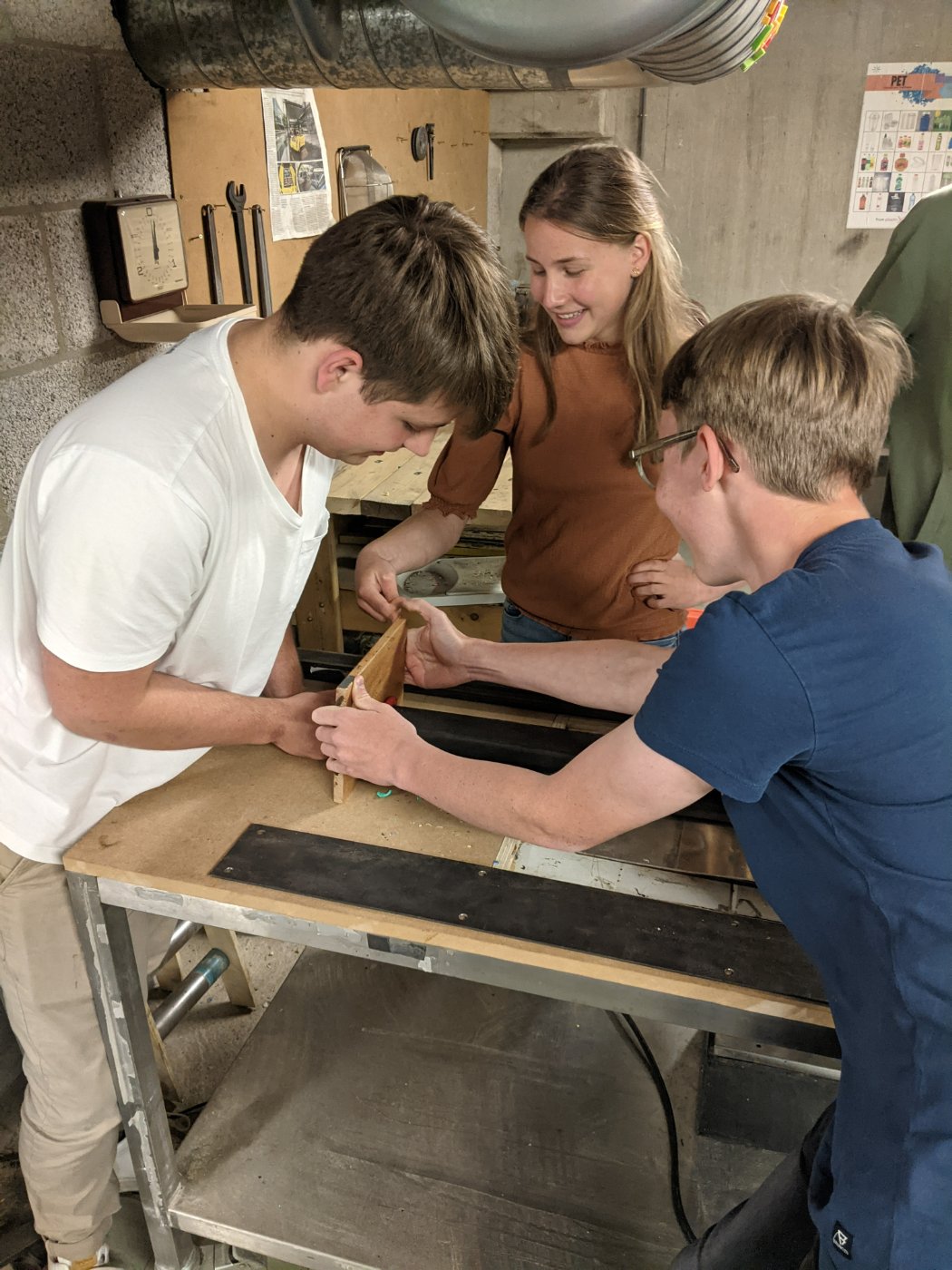 Von Donnerstag bis Samstag tagte die Gruppe dann am Augustinianum in Eindhoven. An unserer Partnerschule wurde der Blick nach vorne eröffnet und Möglichkeiten und Grenzen von Recycling von Plastik aufgezeigt und durch spannende Gastbeiträge aus der Industrie ergänzt. Am Freitag hatte die Gruppe dann die Möglichkeit Recycling konkret umzusetzen, indem sie gemeinsam eine Sitzbank aus alten Plastikdeckeln herstellte.