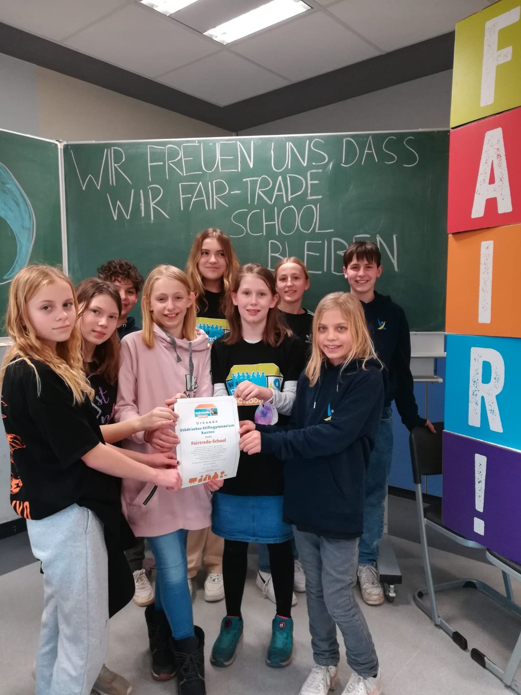 Fair­trade Deutsch­land schreibt uns zur Rezer­ti­fi­zie­rung als Fairtrade-School: