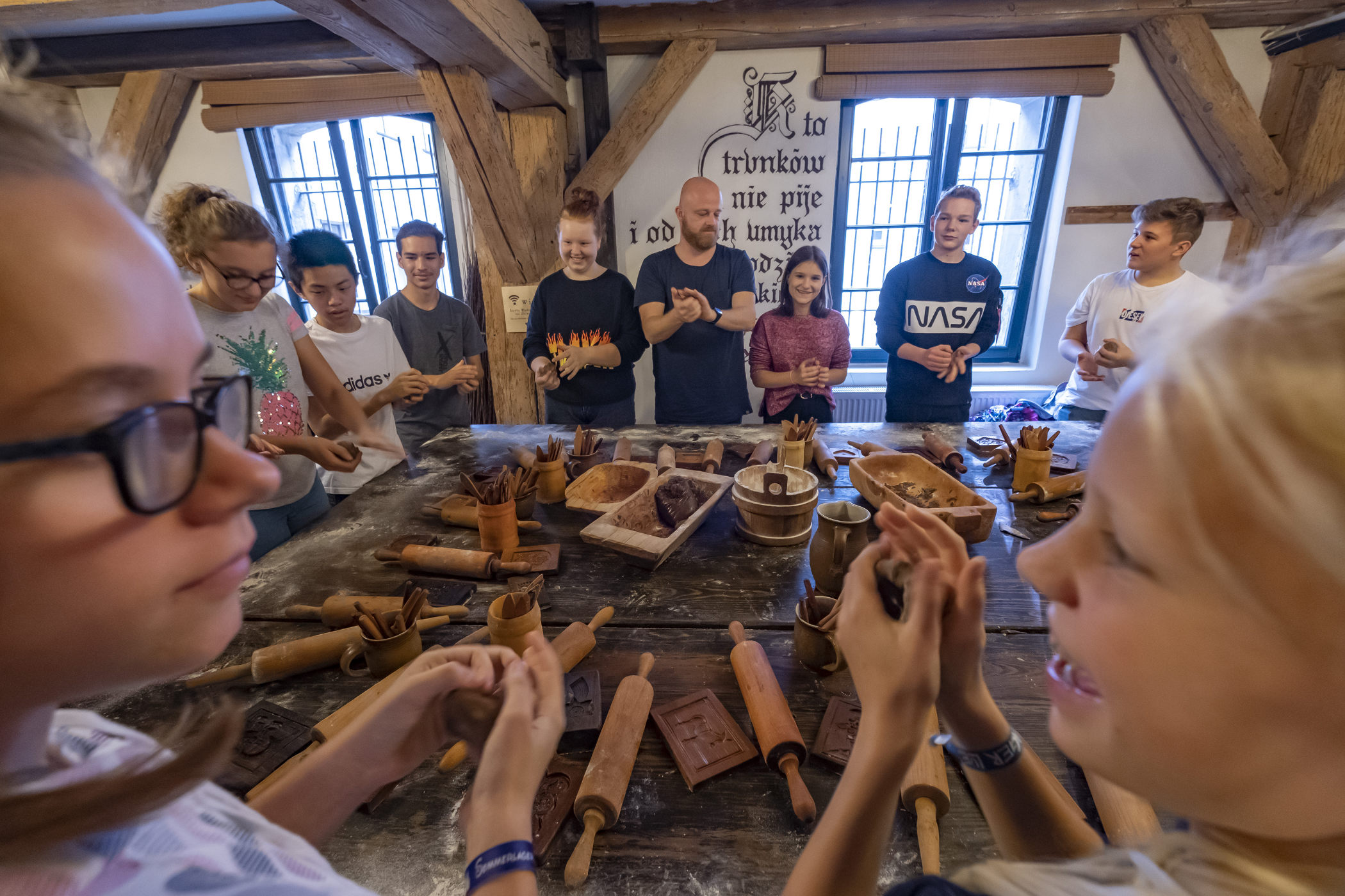 So backten wir gemeinsam die beste Pizza der Stadt, lernten das Lebkuchenhandwerk in der Kopernikusstadt Toruń kennen, Pierogi, Bigos und andere polnische Spezialitäten waren ebenfalls mit von der Partie. Doch da man sich ja nicht ausschließlich den Bauch vollschlagen wollte, hielten uns zahlreiche Aktivitäten wie die Seifenherstellung in Bydgosz, abwechslungsreiche Integrationsspiele zum Kennenlernen, ein Besuch im Spaßbad, Bowling oder auch der Aufstieg auf den Turm des Wasserschlosses in Świecie immer in Bewegung.