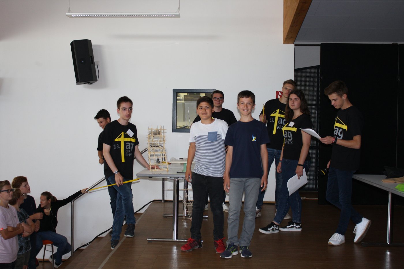 Der Wettbewerb war ein voller Erfolg. 114 Schülerinnen und Schüler in über 50 Teams stellten sich der Herausforderung einen Lastkran aus Schaschlikspießen, Kleber und Faden zu bauen, der eine Mindesthöhe von 40 cm haben musste und an dessen Ausleger in einem Abstand von 25 cm ein Gewicht von 500 g angehängt wurde. Der Kran durfte ein Gegengewicht z. B. in Form eines Sandsackes besitzen und musste der Last 30 Sekunden standhalten. Ziel war es, den leichtesten Kran mit dem geringsten Gegengewicht zu bauen. Die Schülerinnen und Schüler bewiesen viel Ausdauer und Kreativität, sowohl beim Entwurf der Kräne, als auch bei der künstlerischen Gestaltung.